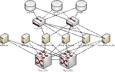 为了满足服务器24小时不间断性运行的要求,我们的网络方案为冗余多机群集方案。我们在中心配置两台域服务器(双机群集)、四台应用及数据库服务器(四机群集)、两台SAN交换机(双机容错)、一台在线存储作为一级存储、配置一台备份存储作为一级备份、配置一台磁带库作为二级备份。